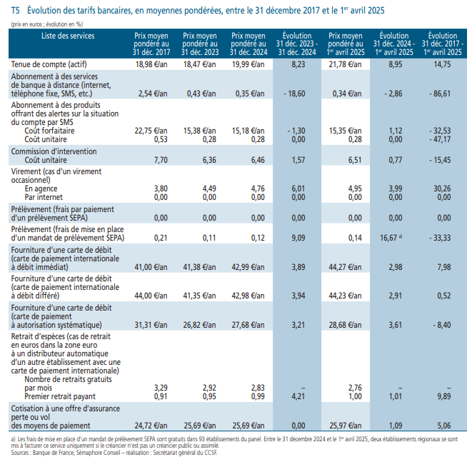 Sur les quatorze produits et services bancaires présentés sur le document d’information tarifaire et suivis dans le cadre de l’OTB, dix tarifs sont en hausse. Les hausses les plus prononcées concernent les frais de tenue de compte (+8,95 %) et les cartes de paiement internationales (+2,91 % et +2,98 % en fonction du type de carte).